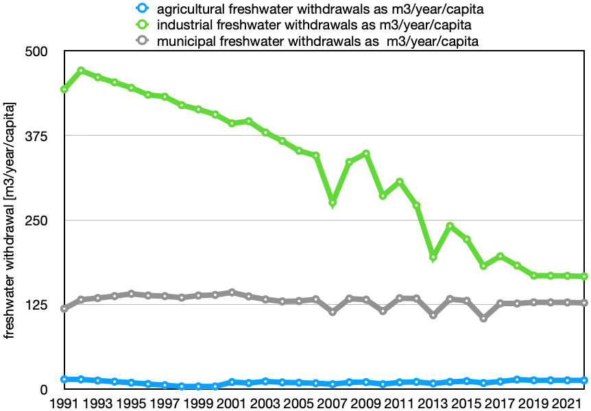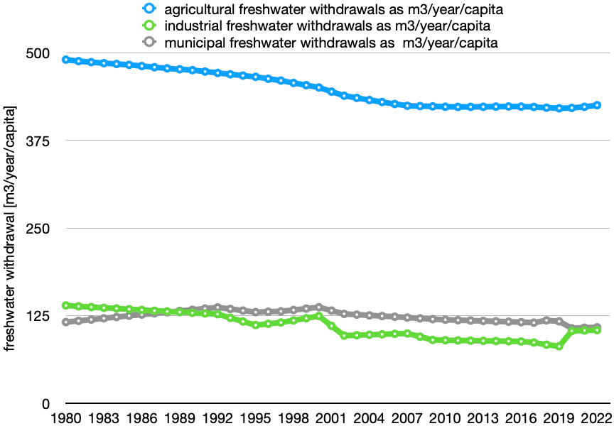 Figure 1: Freshwater withdrawal by sector in the USA in m3/capita/year from 1980 to 2022.Figure 2: Freshwater withdrawal by sector in Germany in m3/capita/year from 1991 to 2022.Figure 3: Freshwater withdrawal by sector in Japan in m3/capita/year from 1980 to 2022.